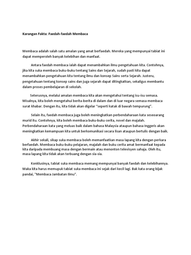 Faedah paling utama dalam mengamalkan budaya membaca ialah ia akan meluaskan pengetahuan setiap individu. Contoh Karangan Bahasa Malaysia. Di samping itu pihak kerajaan juga boleh memainkan peranan.